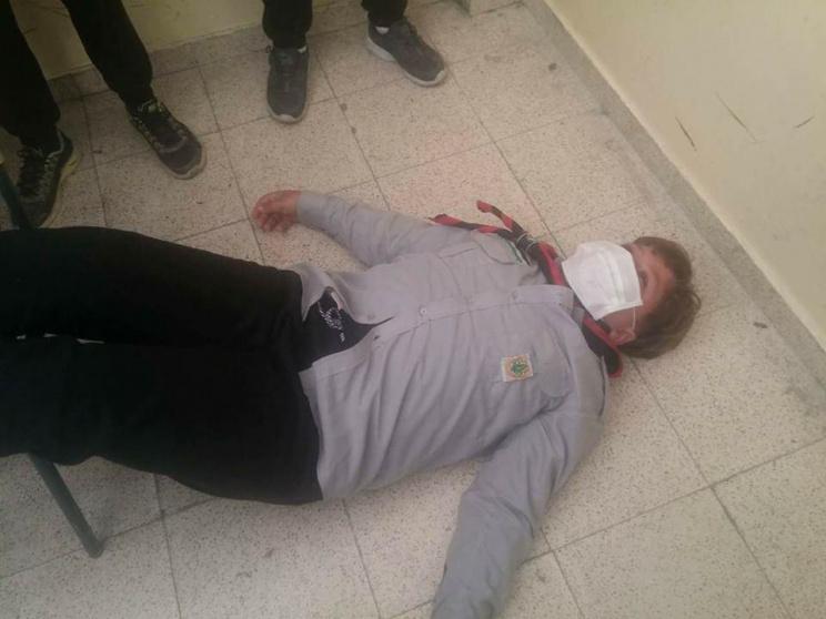 طفل ملقى على الارض جراء اصابته بالاختناق بفعل قنابل غاز اطلقها جيش الاحتلال على مدرسته بالخليل