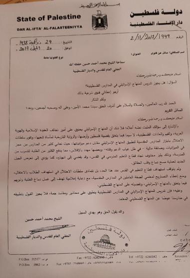 يشار إلى أن الفتوى التي أصدرها مفتي القدس والديار المقدسة الشيخ محمد حسين كانت قد نصت على أن: "تدريس المنهاج الإسرائيلي في المدارس الفلسطينية ينطوي على محاذير ومفاسد جمة، فلا يجوز القبول بتطبيقه في مدارسنا عوضاً عن المنهاج الفلسطيني المعتمد".