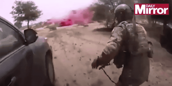 ويظهر في الفيديو الجنود الأميركيين وهم يواجهون هجوما بالرشاشات والقنابل اليدوية، بينما يحاولون الدفاع عن أنفسهم وإطلاق قنابل الدخان ذات اللون الأحمر في محاولة واضحة للحصول على دعم جوي.