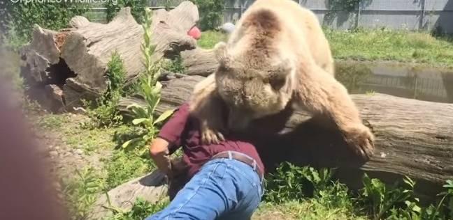 لحظة مروعة لإحدي الدببة تزن نحو 400 رطل، وهي تمتطي ظهر أحد الأشخاص بشكل مذهل، والذي أظهر شجاعة ورضا بالموقف.