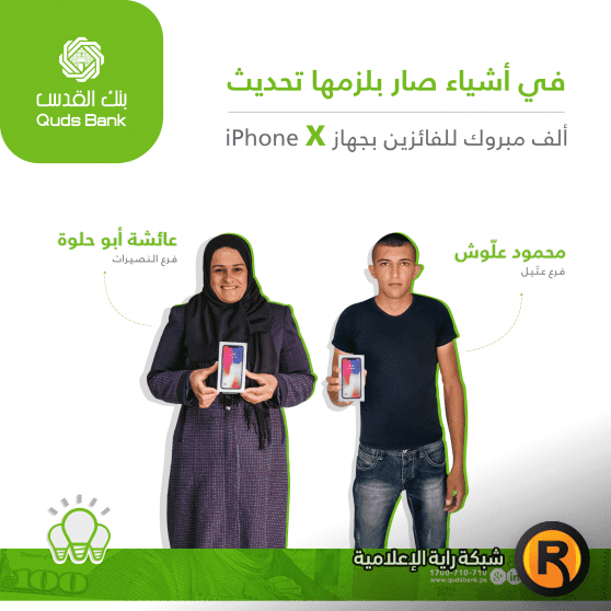 سلّم بنك القدس الجائزة الثانية لحملة تحديث البيانات "في أشياء صار بلزمها تحديث" عن شهرشباط والمتمثلة بـ IPhone X، للرابحين السيدة عائشة أبو حلوة - فرع النصيرات والسيد محمود علوش – فرع عتيل وتأتي هذه المبادرة ترسيخا لنهج البنك المتمثل في الحفاظ على عملائه وتوطيد علاقته بهم، هذا ويستمر البنك بتقديم جوائزه على مدار العام.