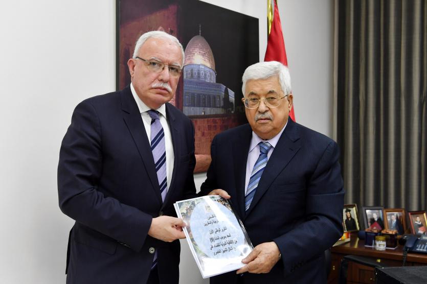 تسلم الرئيس محمود عباس من وزير الخارجية والمغتربين رياض المالكي، تقرير دولة فلسطين الوطني الأول، والمعد وفقا للمادة التاسعة من اتفاقية الأمم المتحدة للقضاء على جميع أشكال التمييز العنصري.