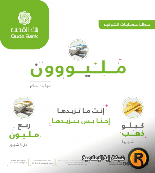 أطلق بنك القدس حملة جوائز حسابات التوفير الجديدة للعام 2018 (أنت ما تزيدها إحنا بس بنزيدها )، وبهذا تستمر الجوائز على حسابات التوفير المقدمة من بنك القدس لتكون هي الجوائز الأضخم على مستوى الوطن، وتأتي هذه الخطوة لتشجيع الادخار لدى عملاء البنك القائمين والمحتملين ومنح جميع هؤلاء فرصاً جديدة للفوز بجوائز مجزية.