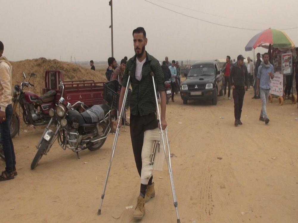 بكثير من الاحترام ينظر المشاركون في مسيرات العودة على حدود قطاع غزة الشرقية الى الشاب محمد حامد خلال تجوله بين خيام العودة بساق واحدة وهو يحمل جسده على عكازين وعيناه تحلقان بفخر في فضاء المخيم.