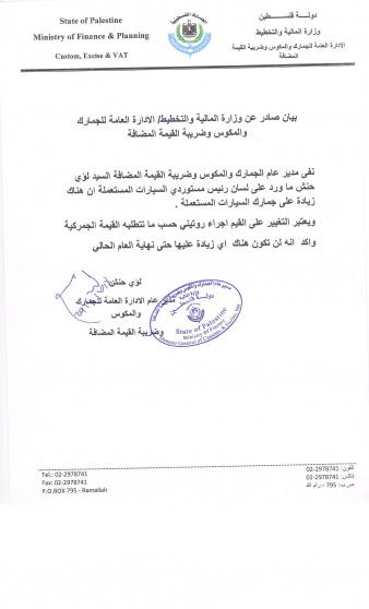 وكان أكرم العووادة رئيس اتحاد مستوردي السيارات المستعملة في فلسطين، قال إن السيارات المستوردة، ستشهد ارتفاعاً في الأسعار، خلال الأيام المقبلة.