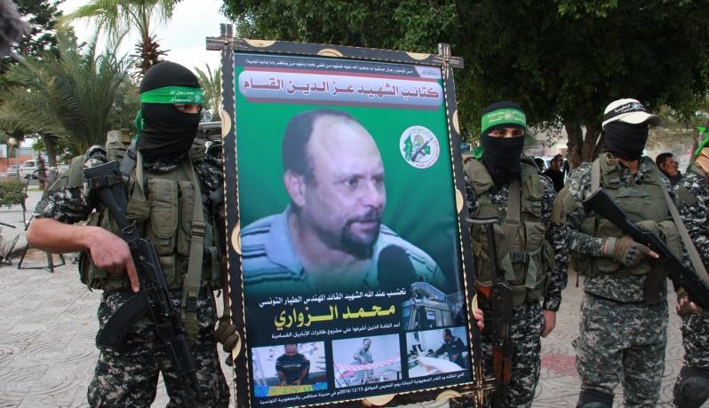 عنصران من كتائب القسام يرفعان صورة المهند الزواري