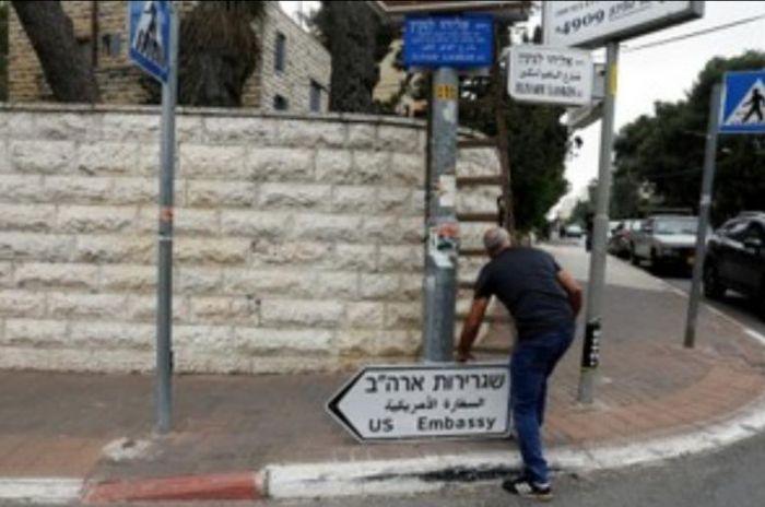 في خطوة أخرى نحو كشف الستار عن السفارة الامريكية في مدينة القدس المحتلة، وضع الاحتلال لافتات على أحد الطرق في مدينة القدس، تشير إلى مكان السفارة الأمريكية، تمهيدا لافتتاحها الأسبوع المقبل.