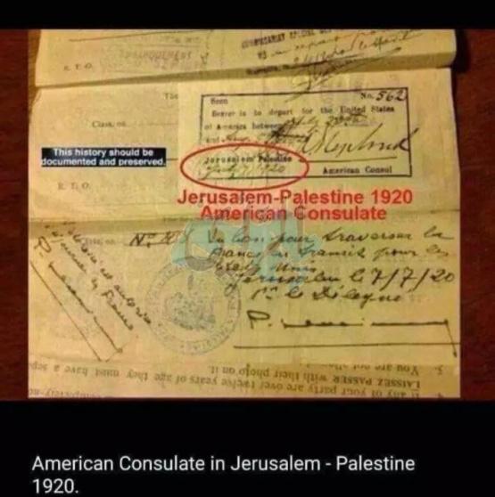 وعلق النشطاء على الوثيقة بالقول: "من فمك ندينك"، في إشارة إلى ان ما كتب على وثيقة القنصلية الأمريكية آنذاك العبارة التالية: "القنصلية الامريكية (قنصلية الولايات المتحدة) في القدس فلسطين" وليس اسرائيل.