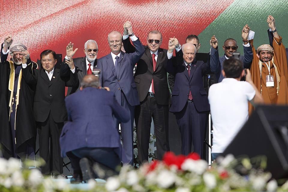 وحمل المشاركون في المظاهرة التي جرت في ميدان "يني قابي"، بمشاركة الرئيس التركي رجب طيب أردوغان، ورئيس الوزراء رامي الحمد الله، العلمين الفلسطيني والتركي، وصور المسجد الأقصى وقبة الصخرة المشرفة، كذلك صور الشهداء الذين ارتقوا في المجزرة الإسرائيلية الأسبوع الماضي خلال مسيرات العودة على حدود قطاع غزة، ورددوا الشعارات والهتافات المنددة بجرائم الاحتلال.