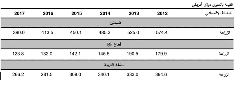 مؤشراتٌ غير مطمئنة، حملتها إحصائيات جهاز الإحصاء الفلسطيني حول قيمة مساهمة القطاع الزراعي في الناتج المحلي الإجمالي الفلسطيني خلال السنوات الأخيرة، فقد بلغت 574.4 مليون دولار عام 2012 بينما تراجعت في العام الماضي إلى 390 مليونا أي بنسبة 2.8 % من الناتج المحلي الإجمالي فقط، علماً بأنها كانت تبلغ 14 % عام 1994.