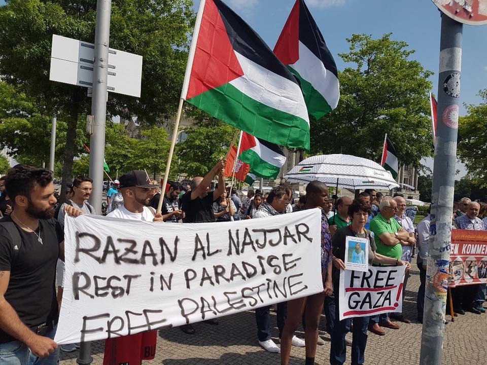 وحسب ما أوردته دائرة شؤون المغتربين من منظمي التظاهرة الاحتجاجية، فقد ندد المشاركون في المظاهرة بموقف الحكومة الألمانية في استقبال نتنياهو الملطخة يديه بدماء المدنيين العزل في مسيرات العودة الكبرى في قطاع غزة، وأخرهم الشهيدة المسعفة رزان النجار التي قتلت بدم بارد من قبل قناصة جنوده اثناء قيامها بعملها الإنساني الطبي في اسعاف ومعالجة الجرحى الفلسطينيين.