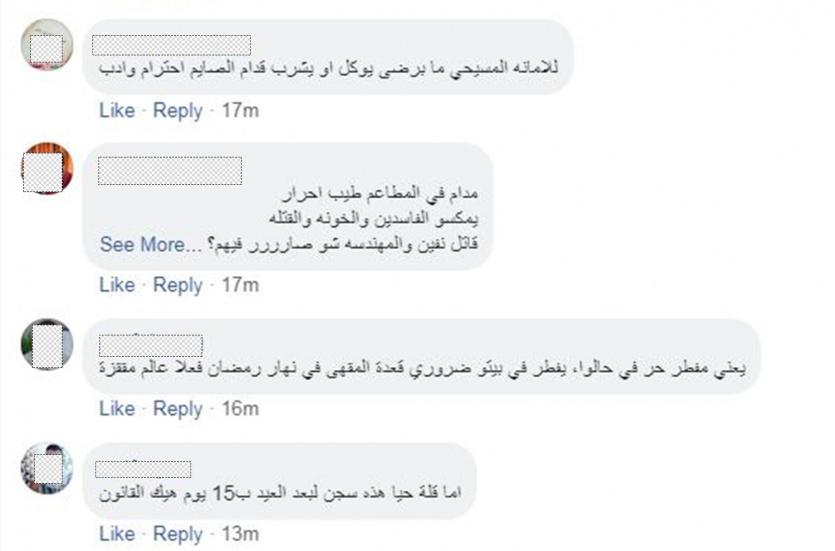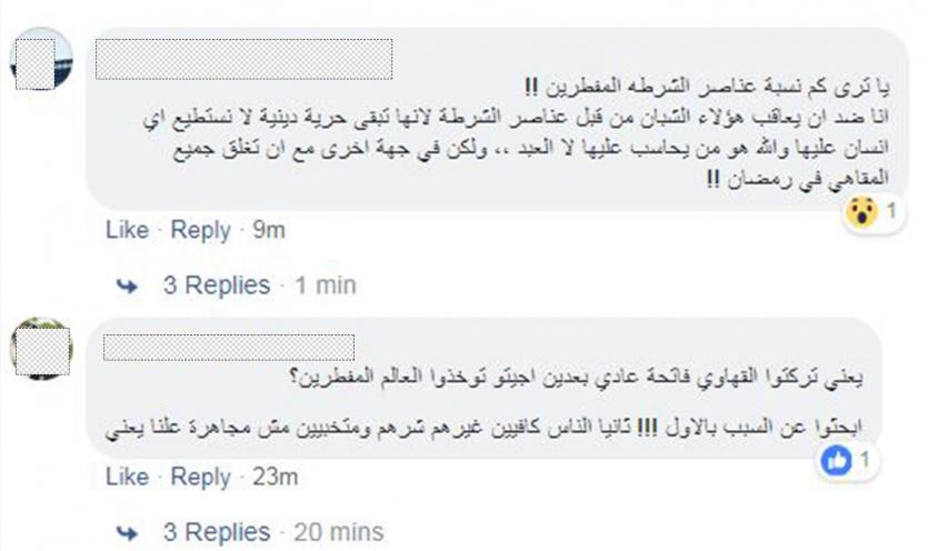 ويرى المدافعون أن الإفطار جهارًا ينتهك حرمة الشهر الفضيل ولا يراعي مشاعر الصائمين، في حين يرى المعارضون أن مسألة الصوم حرية دينية تتعلق بالشخص نفسه، وفي حال إفطاره داخل مقهى فإن ذلك لا يقلل من احترام الصائمين أبدًا.