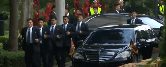 وفي فيديو لوكالة "رويترز"، كان الحراس الشخصيون لكيم يركضون بمحاذاة سيارته المرسيدس السوداء، مشكلين حلقة حولها.
