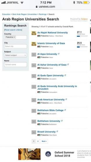 وبحسب تصنيف اليو اس نيوز ريبورت فإن جامعة النجاح قد حصلت على المرتبة الأولى، وتليها في المرتبة الثانية الجامعة الإسلامية في غزة.