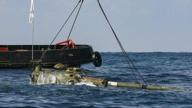 وشاهد متفرجون الدبابات أثناء إنزالها في الماء على مسافة نحو ثلاثة كيلومترات من الساحل يوم السبت.
