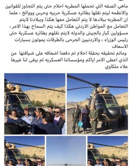 شن رواد مواقع التواصل الاجتماعي هجوماً حاداً على بعض المسؤولين الاردنيين الذين سمحوا للفنانة الاماراتية احلام بالتنقل عبر طائرة هليكوبتر تابعة للجيش الاردني كي تصل الى منطقة البتراء السياحية.