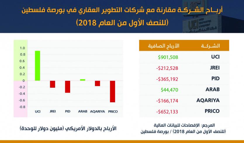أعلنت شركة الاتحاد للإعمار والاستثمار (UCI) أنها سجلت أعلى أرباح بين شركات التطوير العقاري المدرجة في بورصة فلسطين في الربع الثاني من العام 2018 ، فقد أظهرت النتائج المالية لشركة الاتحاد للإعمار والاستثمار(UCI) عن النصف الأول من عام 2018 أنها الشركة العقارية الأكثر ربحية في بورصة فلسطين، حيث تمكنت الشركة من تحقيق هامش ربح مرتفع.