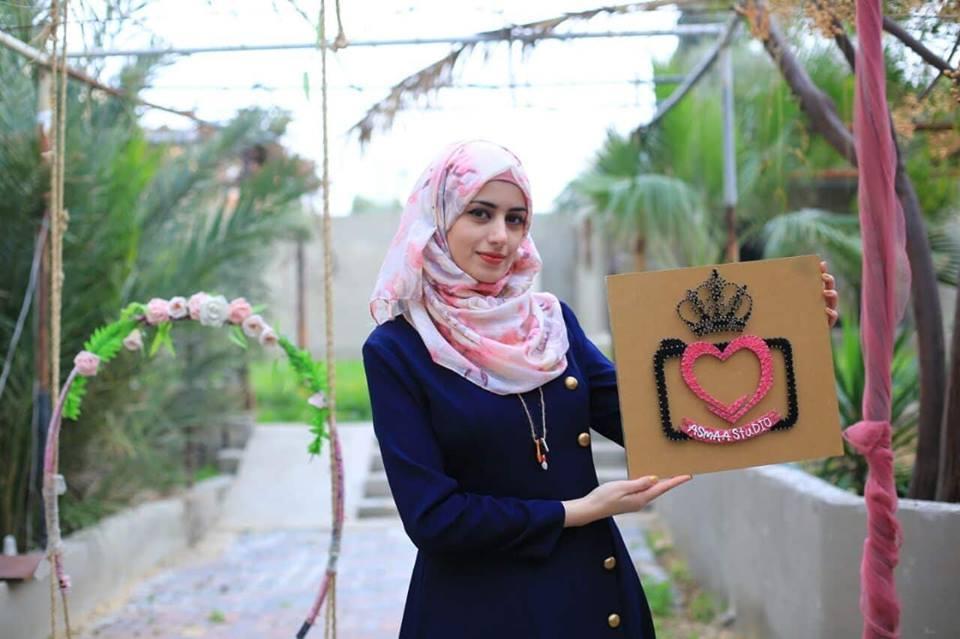 من خلال البحث عبر الانترنت، صادفت وشاح فن الخيوط والمسامير، أحبته وقررت العمل فيه، فبدأت بأول لوحة صغيرة وبسيطة حملت عنوان "القدس"، ثم بدأت بالمحاولة والممارسة مرة تلو الأخرى بمجهود ذاتي.