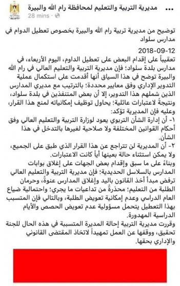 مدارس سلواد مغلقة...والتربية تحذر من ذلك ثم تسحب بيانها