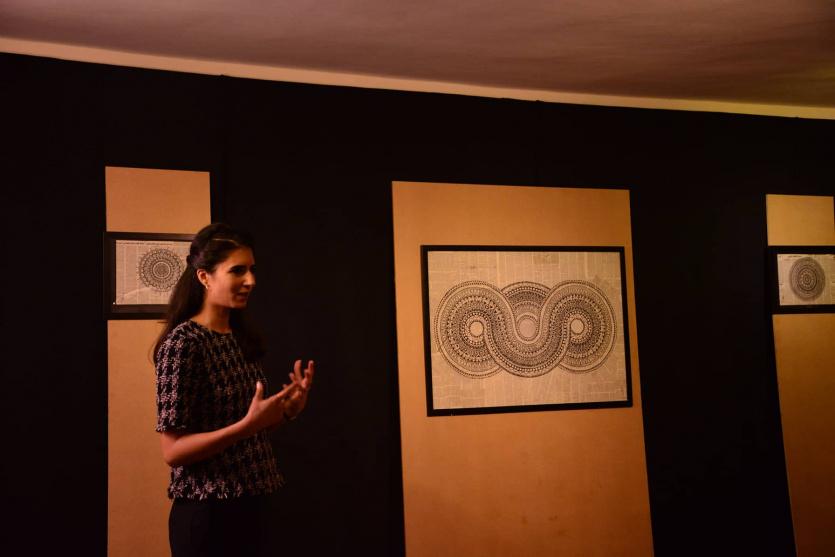 وقامت الفنانة بدمج ورق الجرائد بما تحمله من أخبار برسومات الماندالا وهي الدائرة التي تمثّل الكون وتعطي بزخرفتها التوازن بين العناصر المرئية في العمل الفني.