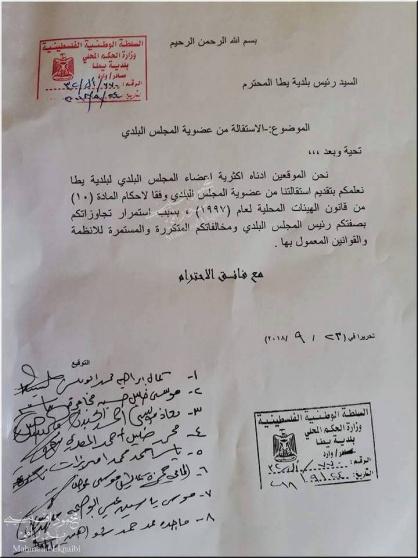 قدم ثمانية أعضاء من مجلس بلدي يطا استقالة جماعية من مناصبهم في البلدية، وذلك احتجاجاً على ما وصفوها بتصرفات وسلوكيات رئيس البلدية المخالفة لأحكام القانون والنظام السارية في الحكم المحلي.