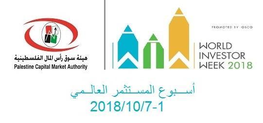 أطلقت هيئة سوق رأس المال الفلسطينية فعاليات "أسبوع المستثمر العالمي" في فلسطين، وهي مبادرة دولية سنوية يتم تنظيمها وإطلاقها من قبل المنظمة الدولية للهيئات المشرفة على أسواق المال ايوسكو"IOSCO" والتي تتمتع الهيئة بعضويتها الكاملة منذ العام 2014.