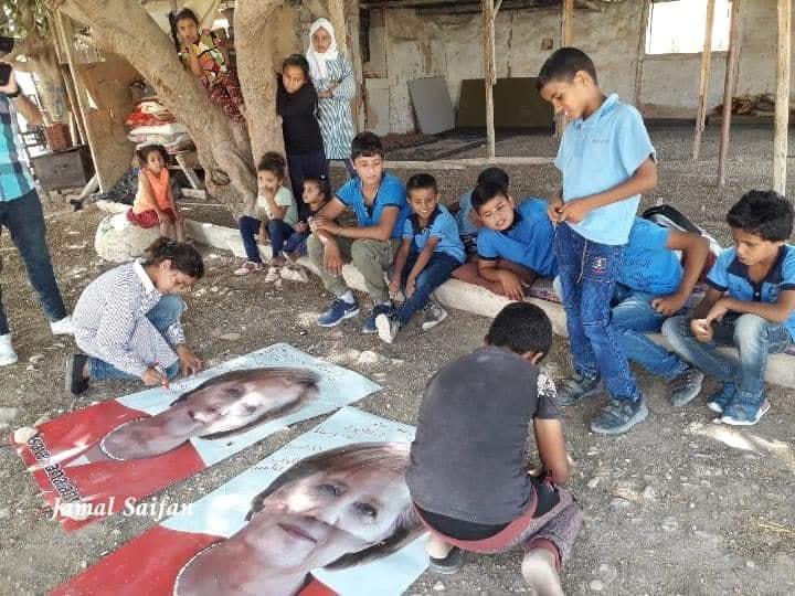 أطفال الخان الأحمر يرفعون صور لميركل كتب عليها مطالبات بمنع هدم قريتهم