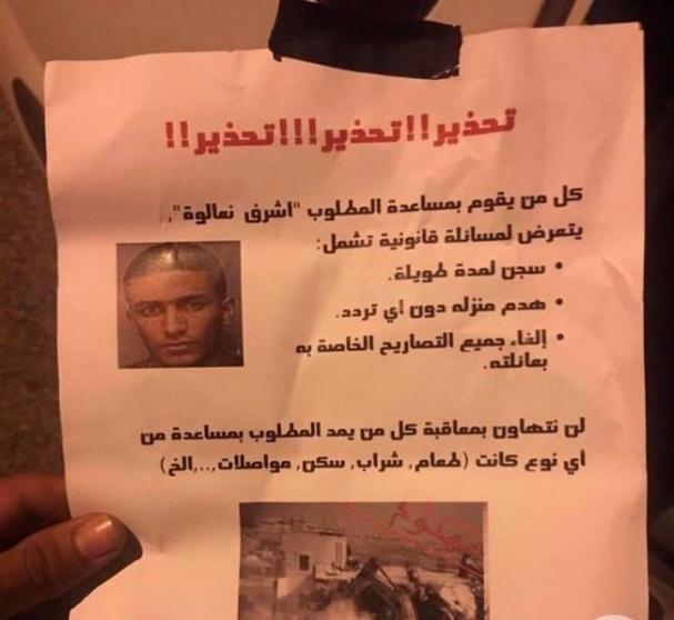 وجاء في المنشور "لن نتردد في معاقبة أي شخص يقدم المساعدة..اي شخص يساعد المطلوب سيخضع إلى عواقب قانونية، بما في ذلك السجن وهدم منزله، وإلغاء جميع تصاريح عائلته".
