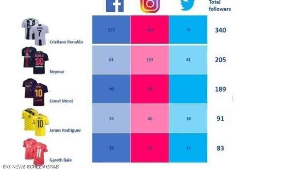 ويتابع رونالدو 143 مليون متابع على إنستجرام، و123 مليون متابع على فيسبوك، و75 مليون متابع على تويتر، وهي أرقام "مذهلة" لم يسبق لأي رياضي الوصول إليها.