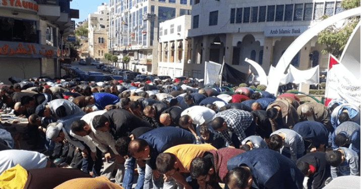 أدى المئات من المواطنين، صلاة اليوم الجمعة، في ساحة دوار ابن رشد وسط الخليل للمطالبة بايقاف تنفيذ قانون الضمان الاجتماعي.