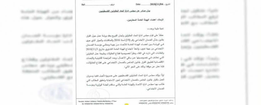 ثالثاً: يؤكد اتحاد المقاولين على تعليق عضويته في مجلس ادارة مؤسسة الضمان الاجتماعي الفلسطيني لحين انهاء الحوار والإستجابة لمطالب اتحاد المقاولين الفلسطينيين وإجراء التعديلات اللازمة على القانون.
