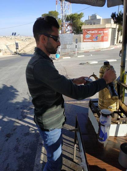 رام الله- راية- شادي زماعرة- منذ عدة سنوات أسلك طريق وادي النار الموحش والشريان الوحيد بين مدن فلسطين الجنوبية والشمالية بألتوائته ومنحدراته الصعبة التي أجبرنا الاحتلال الاسرائيلي البغيض على المرور بها، فيه حكايات وحكايات لكل قاصد باب رزق أو لهفه مشتاق لعائلته بعد سفر طويل متعب، ومن أسراره التي أثارت فضولي بعض السيارات التي تقف باستمرار الى جانب بداية الطريق من الجهة الجنوبية (بداية وادي النار وآخر بلدة العبيدية)، طاولة صغيرة هزيله عليها "دلّة قهوة" نحاسية وغطاء من حرارة الصيف وبرد الشتاء وشاب وسيم بلحيته الخفيفة وعيونه المفعمة بالحياة يتنقل مسرعا كطائر باحث عن الحرية بين السيارات المتوقفة يمينا ويسارا يقدم لهم فنجان قهوة بطعم مميز حتى أصبحت زيارته وشرب قهوته طقوسا يومية للمسافرين.