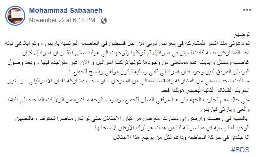 نشر فنان الكاريكاتير الفلسطيني محمد سباعنة توضيحاً -على صفحته عبر فيسبوك- إثر دعوته وعدد من الفنانيين الفلسطينيين إلى معرض دولي من أجل فلسطين في العاصمة الفرنسية باريس، قال فيه إن يرفض المشاركة بسبب وجود فنان إسرائيلي، الأمر الذي يعتبراً تطبيعاً مع الاحتلال.