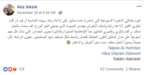 ونشرت المدربة علياء على صفحتها على الفيسبوك:" اليوم مقابلتي الاخيرة الاسبوعية التي استمرت لمدة سنتين على إذاعة راية، وبهذه المناسبة أرغب أن أقدم شكري الكبير لاذاعة راية ولسلام الاطرش مهندس الصوت الذي يضفي الجو المرح، لقد سعدت بالعمل معكم، و أقدم شكري وتقديري العاليين جداً للإعلامية المميزة والمثابرة نجوى الحمدان، التي بذلت كل جهد أسبوعياً على مدار السنتين لتكون المقابلة بأفضل وأبسط شكل ليستفيد منها المستمعين، نجوى الرائعة، كان جميلاً ومميزاً العمل معك، دمت ذخراً للوطن والاعلام".