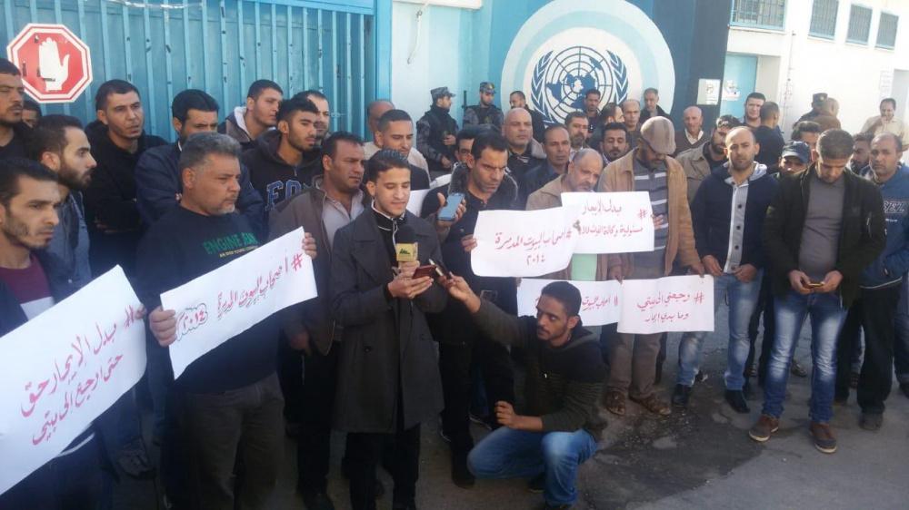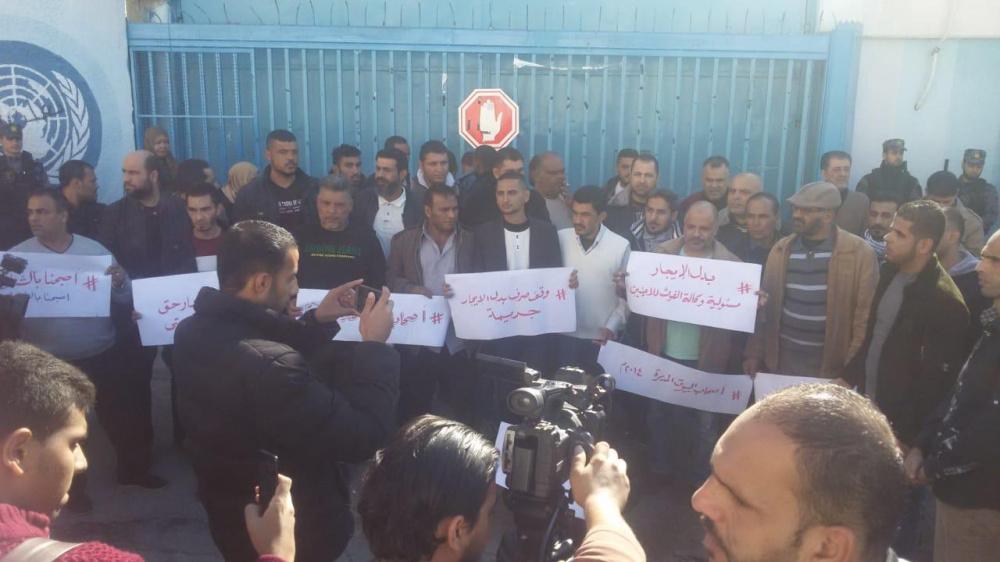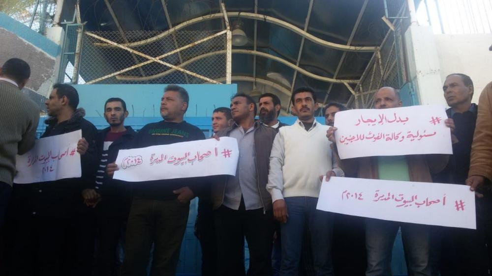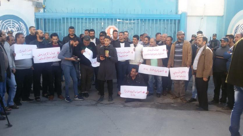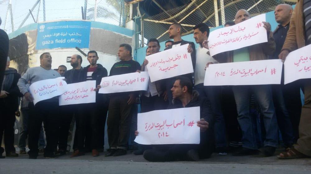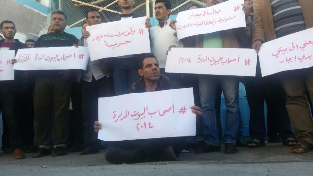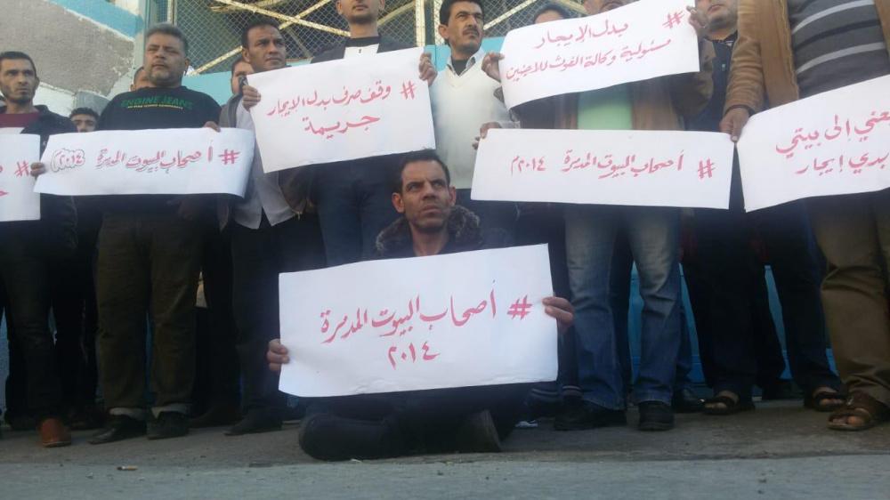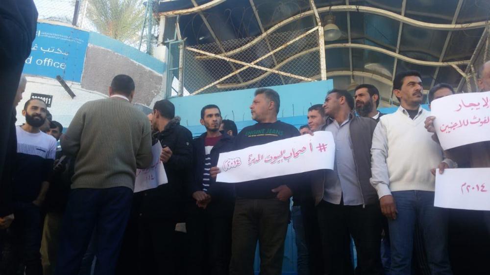 نظم اصحاب البيوت المدمرة في عدوان 2014 صباح اليوم الاحد اعتصام أمام مقر وكالة غوث وتشغيل اللاجئين الفلسطينيين "أونروا" للمطالبة بدفع بدل الايجار الى حين بناء منازلهم المدمرة والعودة اليها.
