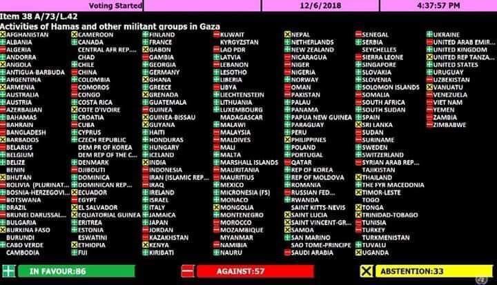 في اليوم التالي أيضا صوت العالم بأغلبية كاسحة (156 صوت) لصالح الحق الفلسطيني في انهاء الاحتلال عن كافة الاراضي الفلسطينية المحتلة عام 1967 بما فيه القدس الشرقية، ضمن مجموعة قرارات توثق الحق الفلسطيني، وتدعمه رغم الانحياز الأمريكي لصالح الاحتلال الاسرائيلي.