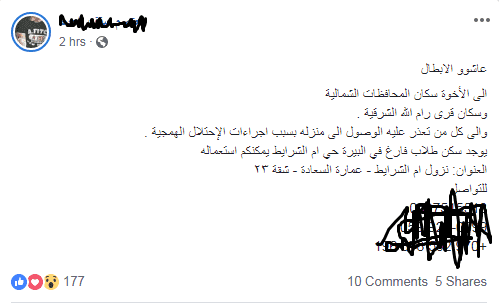 بدأ الفلسطينييون على مواقع التواصل الإجتماعي، بنشر أرقامهم وعناووين منازلهم على صفحاتهم الخاصة، مرحبين بأي مواطن لا يتمكن من الوصول إلى بيته، بعد حصار قوات الاحتلال للمدن الفلسطينية اليوم، وإغلاق الحواجز.