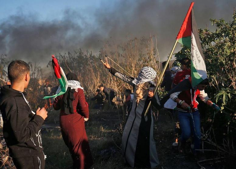 فتاة تلقي الحجارة خلال مواجهات على حدود غزة