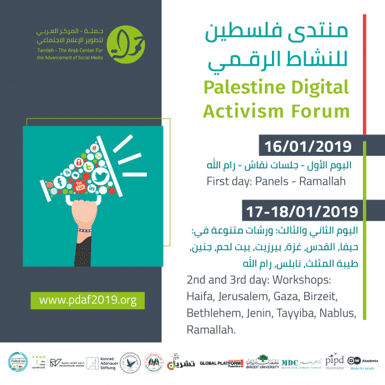 أعلن المركز العربي لتطوير الإعلام الاجتماعي، عن بدء التسجيل لمنتدى فلسطين للنشاط الرقمي الثالث، والمزمع عقده على ثلاثة أيام في تاريخ 16-17-18\1\2019 في مجموعة من محافظات الوطن، حيث ستنطلق أعمال المنتدى في يوم الأربعاء الموافق 16/01/2019 من مدينة رام الله بحضور عدد من ممثلي المؤسسات الكبرى العاملة في هذا المجال وعلى رأسها منظمة العفو الدولية "امنستي" و"هيومن رايتس وواتش" إلى جانب مجموعة من المدربين والمتحدثين الدوليين والمتخصصين في مجالات الإعلام الرقمي والحقوق الرقمية، لينتشر في يومه الثاني والثالث بمجموعة من ورشات العمل في مختلف محافظات الوطن مثل (حيفا، القدس، بيت لحم، غزة، الطيبة، رام الله، نابلس، جنين)