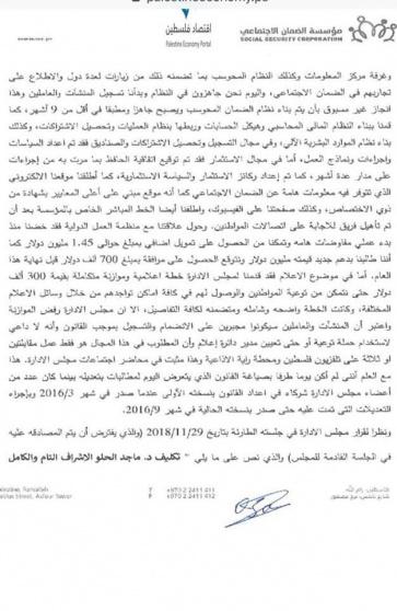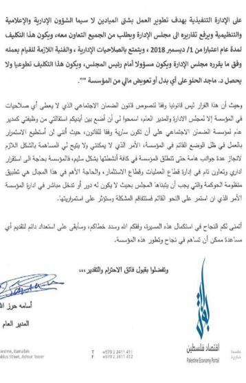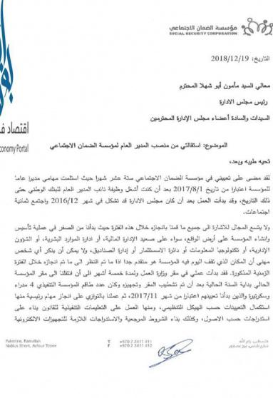 وفي اتصال مع راية أف أم أكد حرز الله نبأ استقالته، فيما نشر موقع "بوابة اقتصاد فلسطين" نسخةً عن استقالة حرز الله التي قدمها إلى رئيس مجلس إدارة مؤسسة الضمان مأمون أبو شهلا، ويتحدث فيها عن أسباب استقالته، وننقلها لكم هنا: