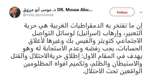 وفي تغريدة لعضو المكتب السياسي لحركة حماس موسى أبو مرزوق، علّق قائلا :"يهدف هذا الإجراء إلى إطلاق الحرية للقتل والاستيطان وتكميم أفواه المظلومين الواقعين تحت الاحتلال الإسرائيلي"، وأضاف في تغريدته: "تفتخر الديمقراطيات الغربية بحرية التعبير، لذلك يجب أن نرفض الإرهاب الإسرائيلي بحق وسائل التواصل الاجتماعي لإجبارها على إغلاق حسابات معينة".