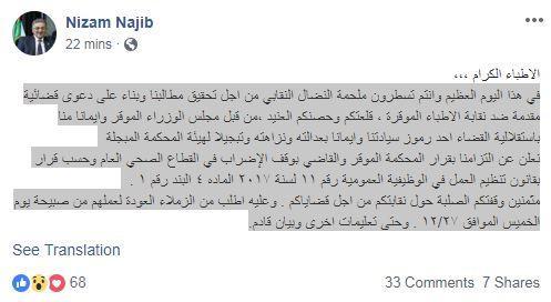 وقال نقيب الأطباء نظام نجيب: ايمانا منا باستقلالية القضاء احد رموز سيادتنا وايمانا بعدالته ونزاهته وتبجيلا لهيئة المحكمة نعلن عن التزامنا بقرارها القاضي بوقف الإضراب في القطاع الصحي العام وحسب قرار بقانون تنظيم العمل في الوظيفية العمومية رقم ١١ لسنة ٢٠١٧ الماده ٤ البند رقم ١.