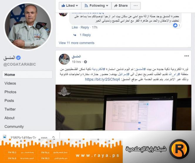 وأعلنت أمس صفحة ما يسمى بـ "المنسق" التابعة لجيش الاحتلال عن تقديم خدمات الكترونية في عملية تقديم التصاريح للمواطنين الفلسطينيين دون الحاجة للذهاب الى مكاتبه – بيت ايل- لتقديم التصاريح أو ما تسمى بـ"الادارة المدنية" في منطقة رام الله والبيرة في إشارة غير مباشرة الى تشجيع التعامل المباشر معها، في محاولة وصفها البعض تهدف الى إلغاء دور وزارة الشؤون المدنية الفلسطينية الجهة الرسمية التي تقوم بمتابعة الطلبات الفلسطينية مع الاحتلال، وهذا ما لوحظ مؤخرا من توغل للاحتلال و"إدارته المدنية" في التواصل مع الجمهور الفلسطيني من خلال مواقع التواصل الاجتماعي المختلفة.