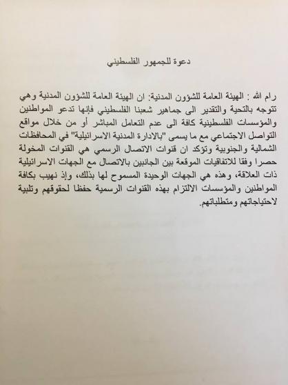 الشؤون المدنية تدعو الى عدم التعامل المباشر مع ما تسمى بــ "الإدارة المدنية" الإسرائيلية