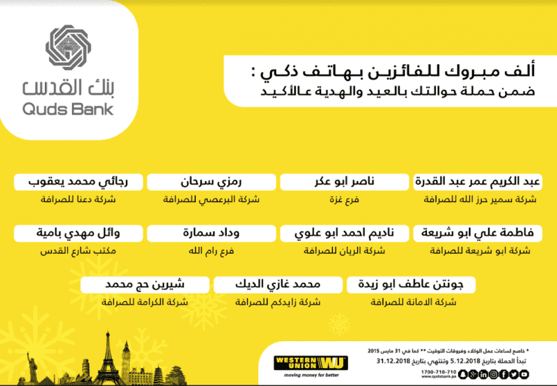 أعلن بنك القدس مؤخرا عن قائمة الرابحين المحظوظين بجائزة جهاز هاتف ذكي ضمن الحملة التي تم إطلاقها على خدمة تحويل الاموال ويسترن يونيون لمناسبة أعياد الميلاد المجيد ورأس السنة الميلادية بعنوان "حوالتك بالعيد والهدية على الأكيد".