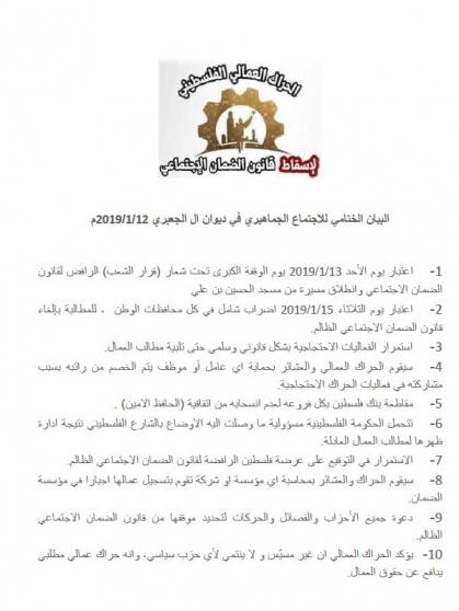 وأكد البيان الاستمرار في الفعاليات الاحتجاجية السلمية والقانونية، وتوعد أي شركة تنضم الى الضمان الاجتماعي.