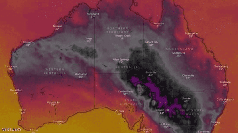 وفي تذكير "مرئي" لخطورة التغير الذي طرأ على طقس أستراليا، أظهرت خريطة مناطق بالبلاد مغطاة باللون الأسود والأرجواني، ويعني هذان اللونان ارتفاعا كبيرا في درجات الحرارة، حسب موقع "فينتيسكي" المعني بأحوال الطقس.