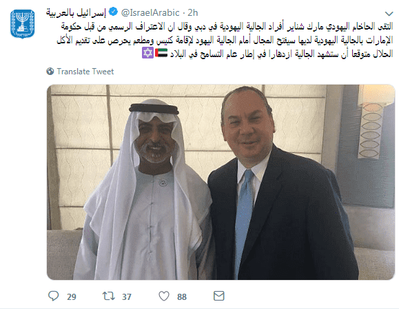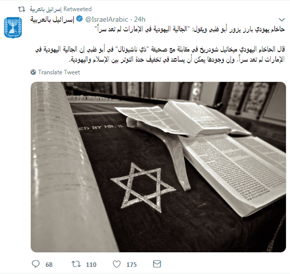 وأعاد أوفير جندلمان، المتحدث باسم رئيس الوزراء الإسرائيلي للإعلام العربي، قبل ساعات مشاركة الحساب الجديد للسفارة الافتراضية عبر تويتر، مغردا "إلى المتابعين الخليجيين الأعزاء، تابعوا هذا الحساب المخصص لكم والموجه إليكم بهدف توسيع رقعة الحوار بيننا وبينكم".