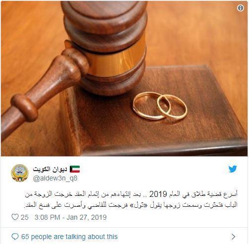 ضجت مواقع التواصل الاجتماعي بقضية زواج شديدة الغرابة، انتهت بالطلاق بعد عقد القران بعدة دقائق، وفقا لما نقله حساب "ديوان الكويت" على موقع تويتر.