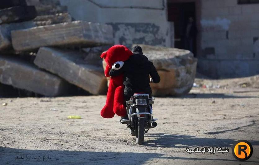 شاب يلتقط الدب الأحمر بيد ويقود دراجته بيده الأخرى،تبدو ملامح الدب الأحمر حزينة وكأنه يقول انا دب صحيح ولكن اسكن في قطاع غزة...عيد حب سعيد.